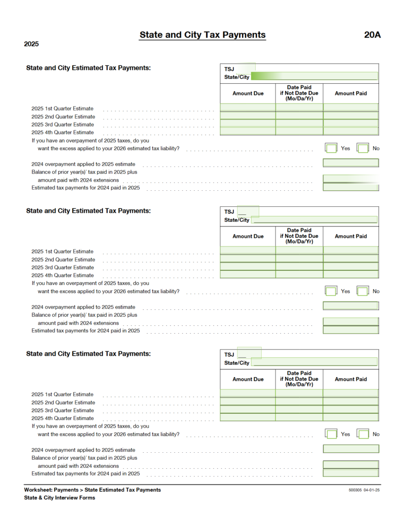 Please be sure to include any federal or state estimated payments you made for the current year, as applicable, along with the amounts and dates the payments were made.